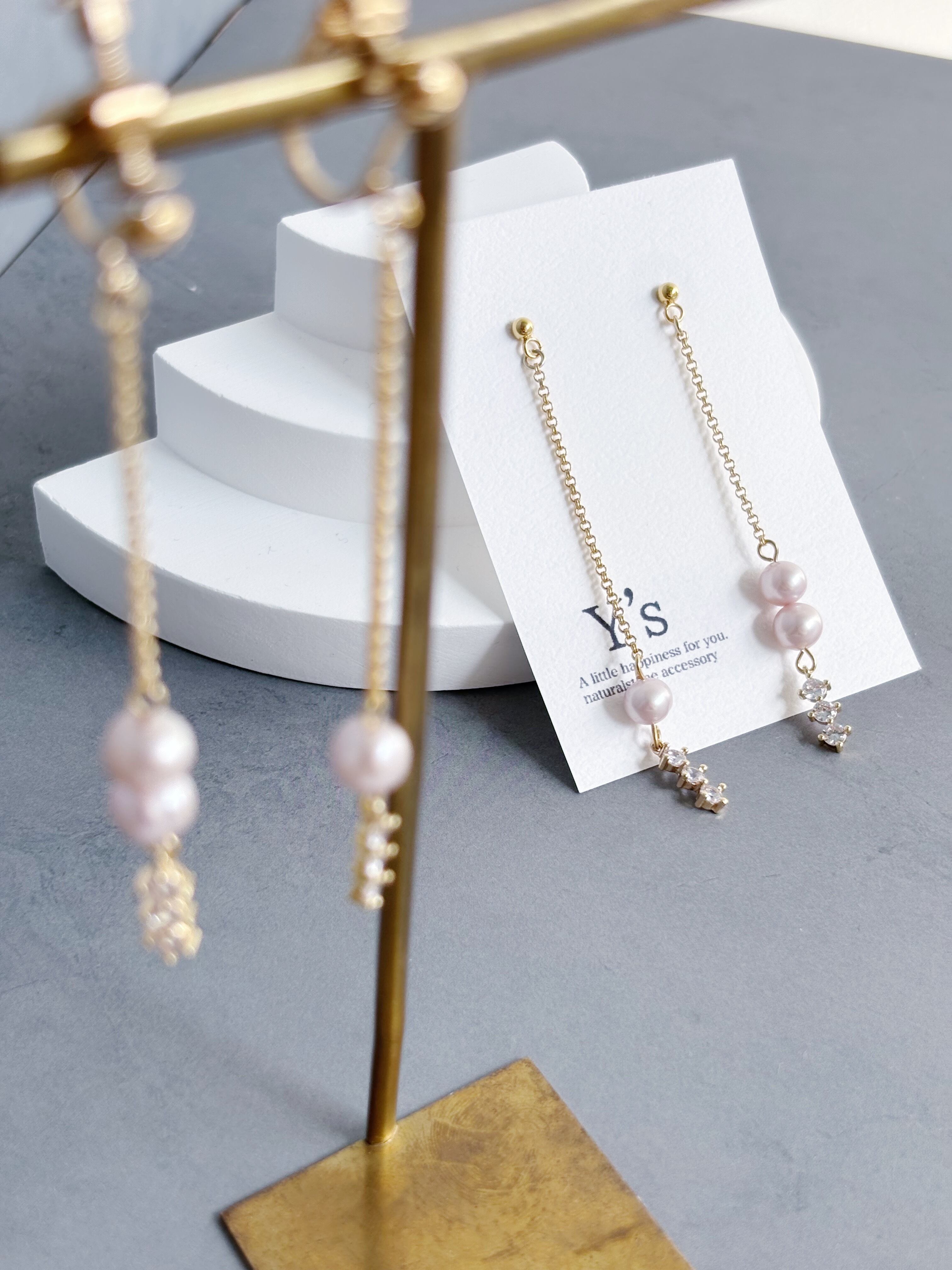エレガントな印象を与えるピンクパールにジルコニアの華やかな煌めきを併せたデザイン。
