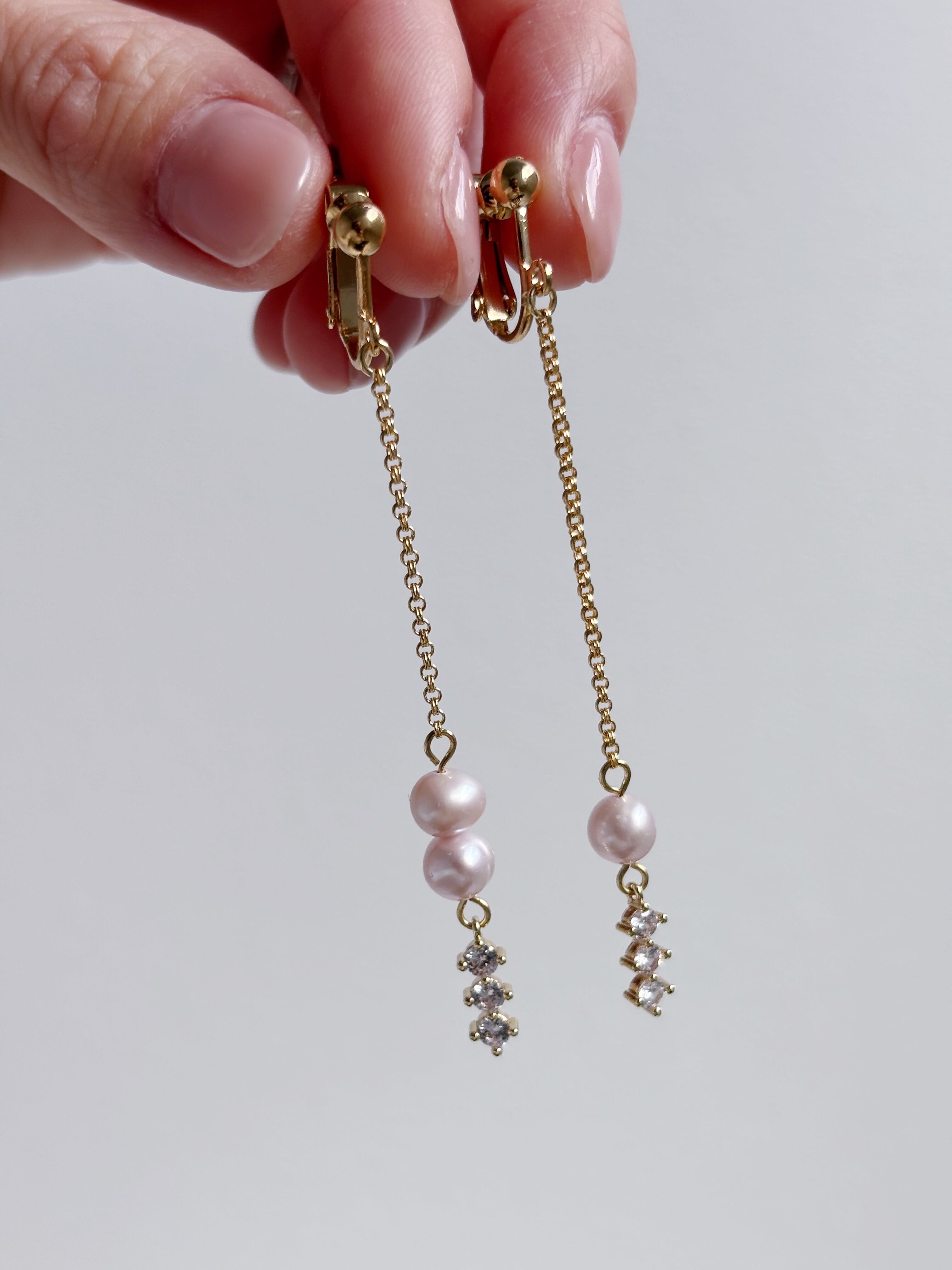 チェーンが耳元で揺れることで、動くたびに光を反射し、華やかさをプラスしてくれるアイテムです。