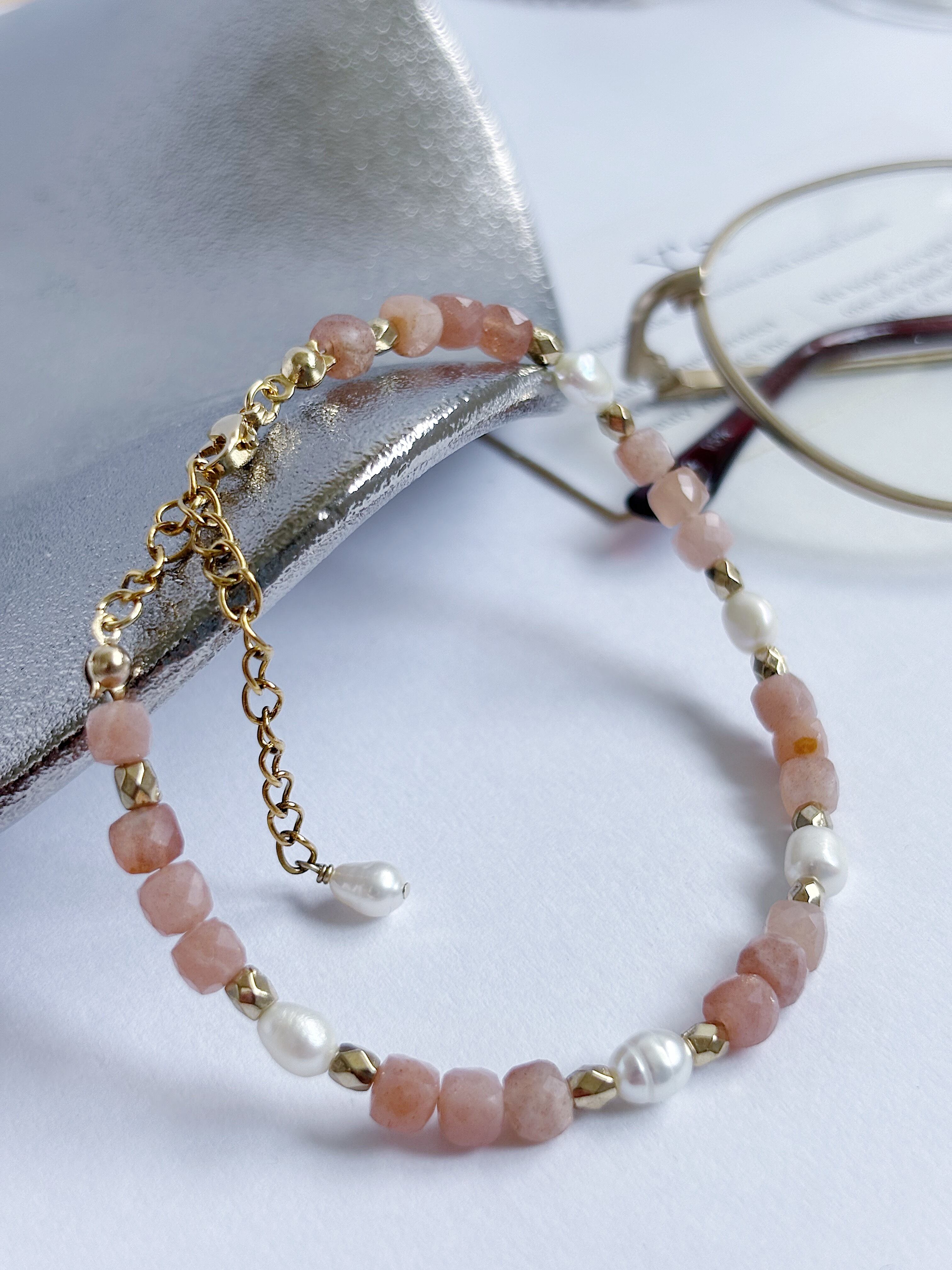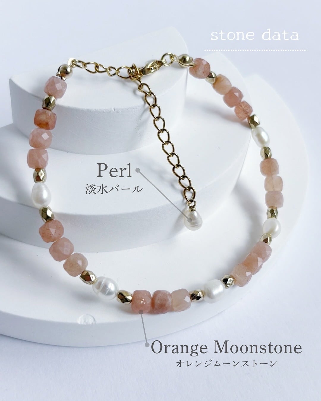 オレンジムーンストーンとパールをバランス良く組み合わせた「Orange Enchantée(オランジュエンシャンテ)」は、肌馴染みの良い色合いが魅力的なブレスレットです。