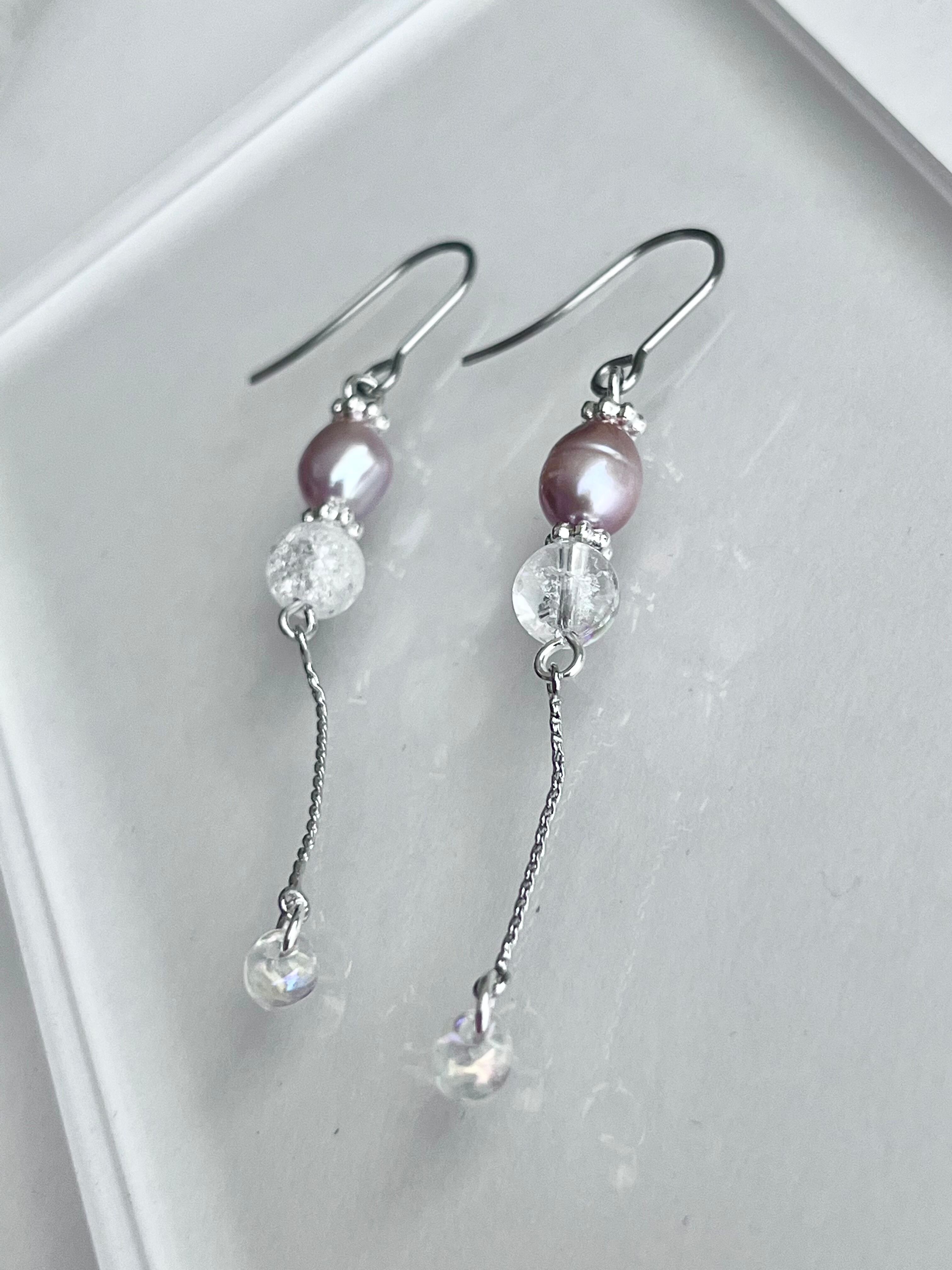 繊細な美しさを放つクラッククォーツと淡い紫の淡水パールを合わせたデザイン。