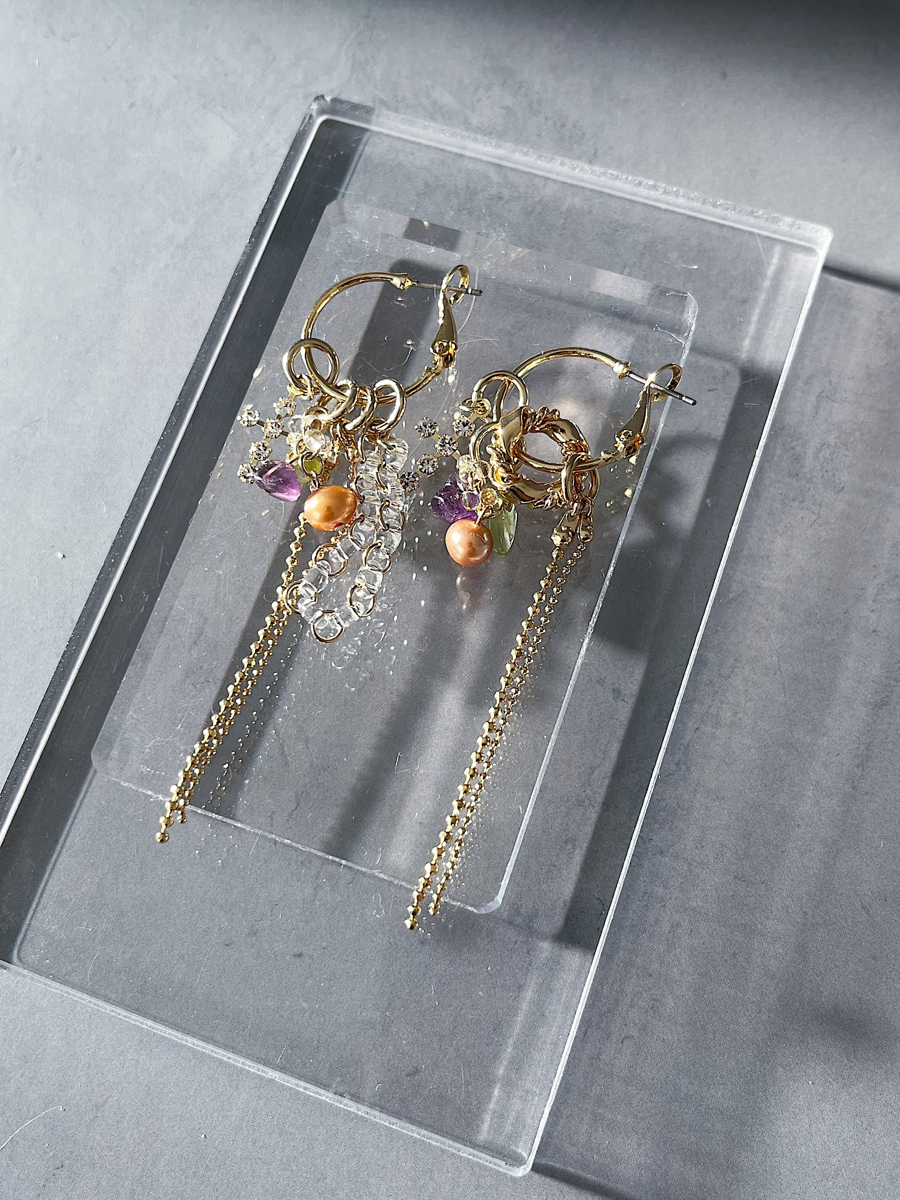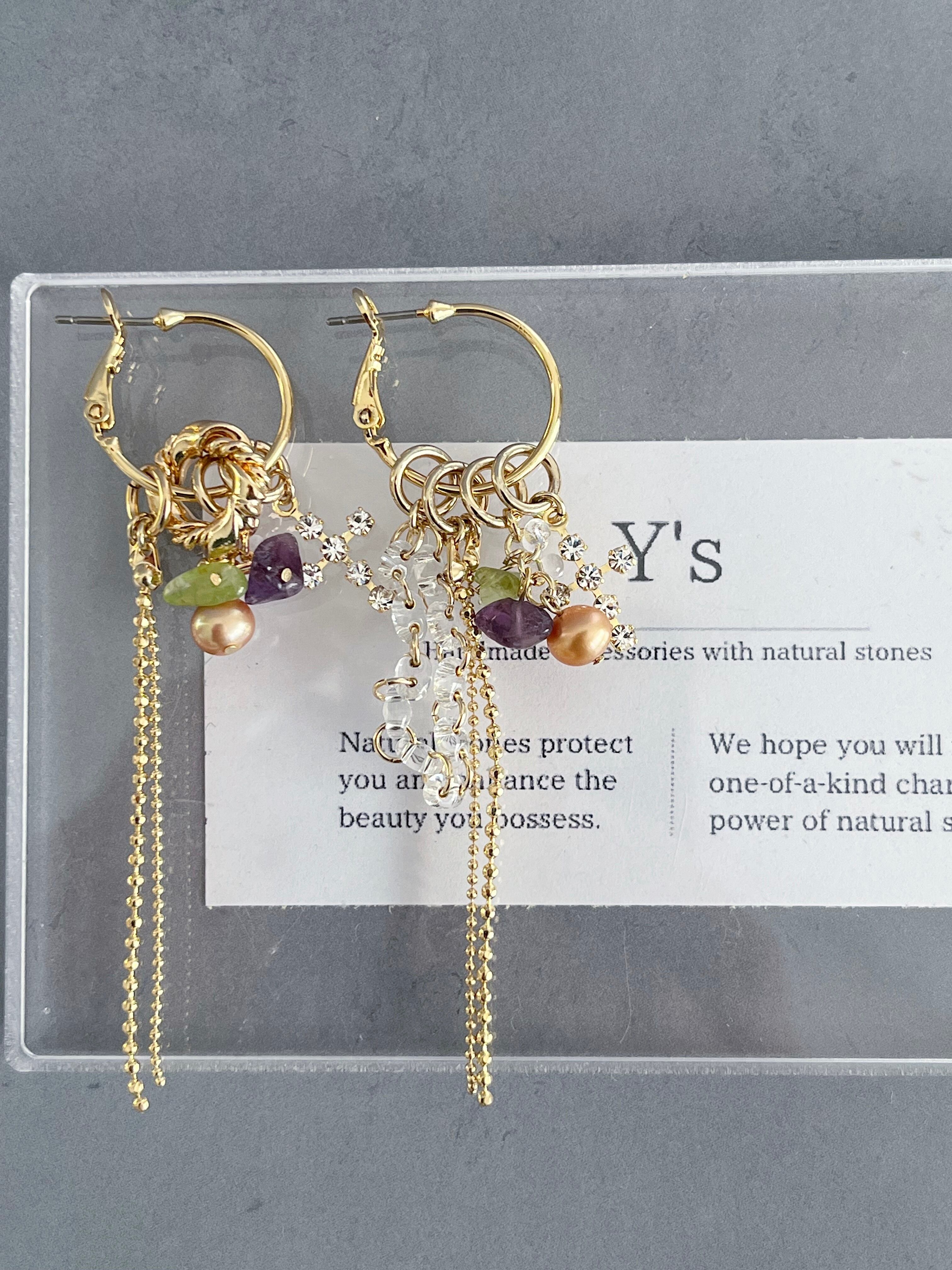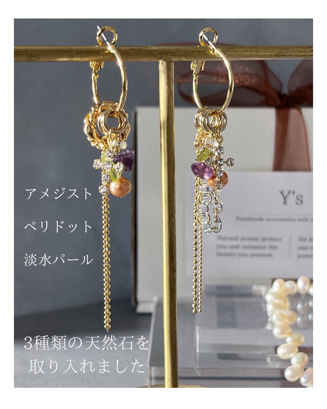 ▶︎使用素材:天然石(淡水パール、ペリドット、アメジスト)、フープピアスポスト部分(チタン)、合金パーツ、ガラスビーズ