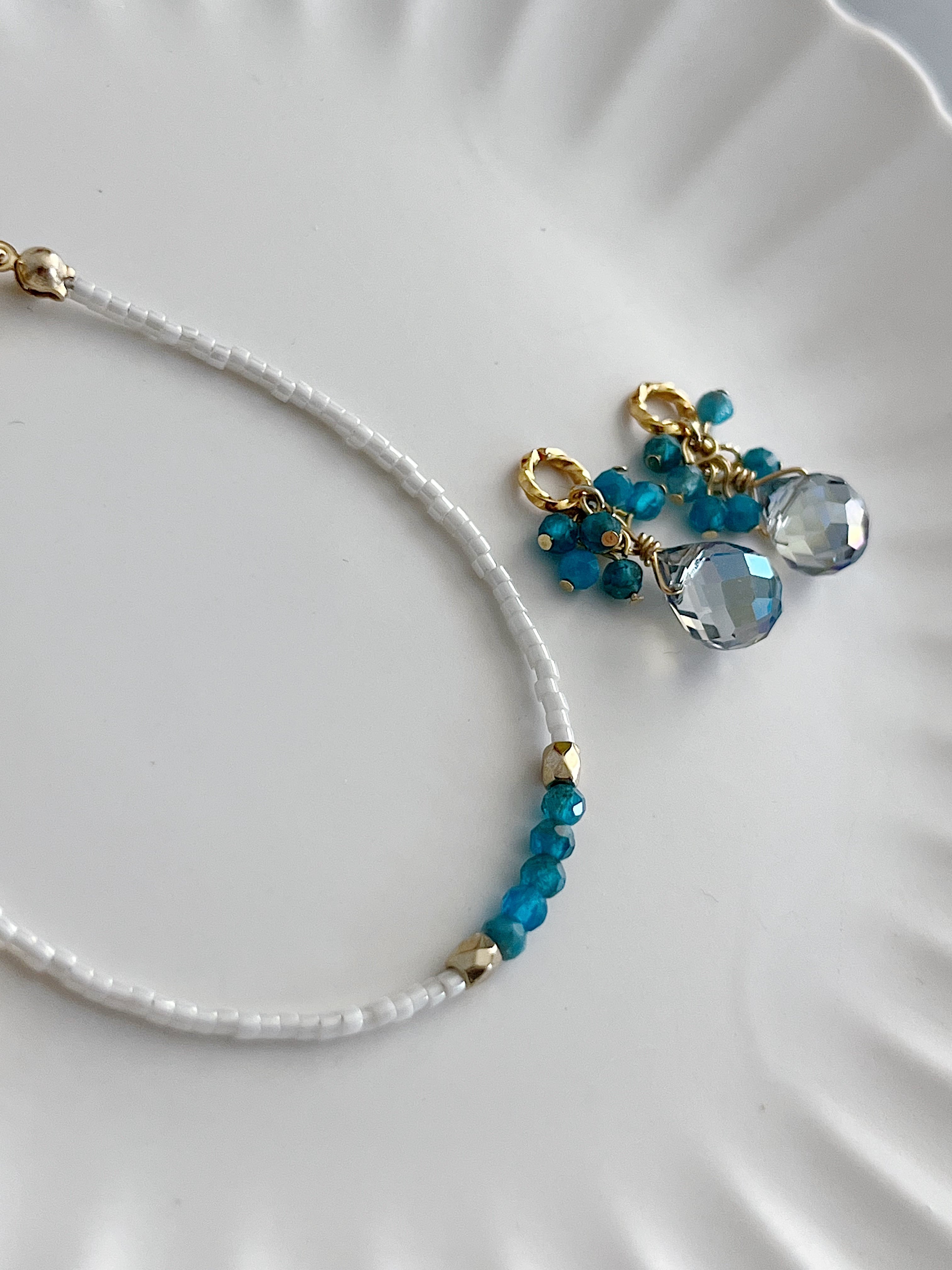 ▶︎素材:合金パーツ、ガラスビーズ、ナイロンコートワイヤー、メタルビーズ、天然石(アパタイト)