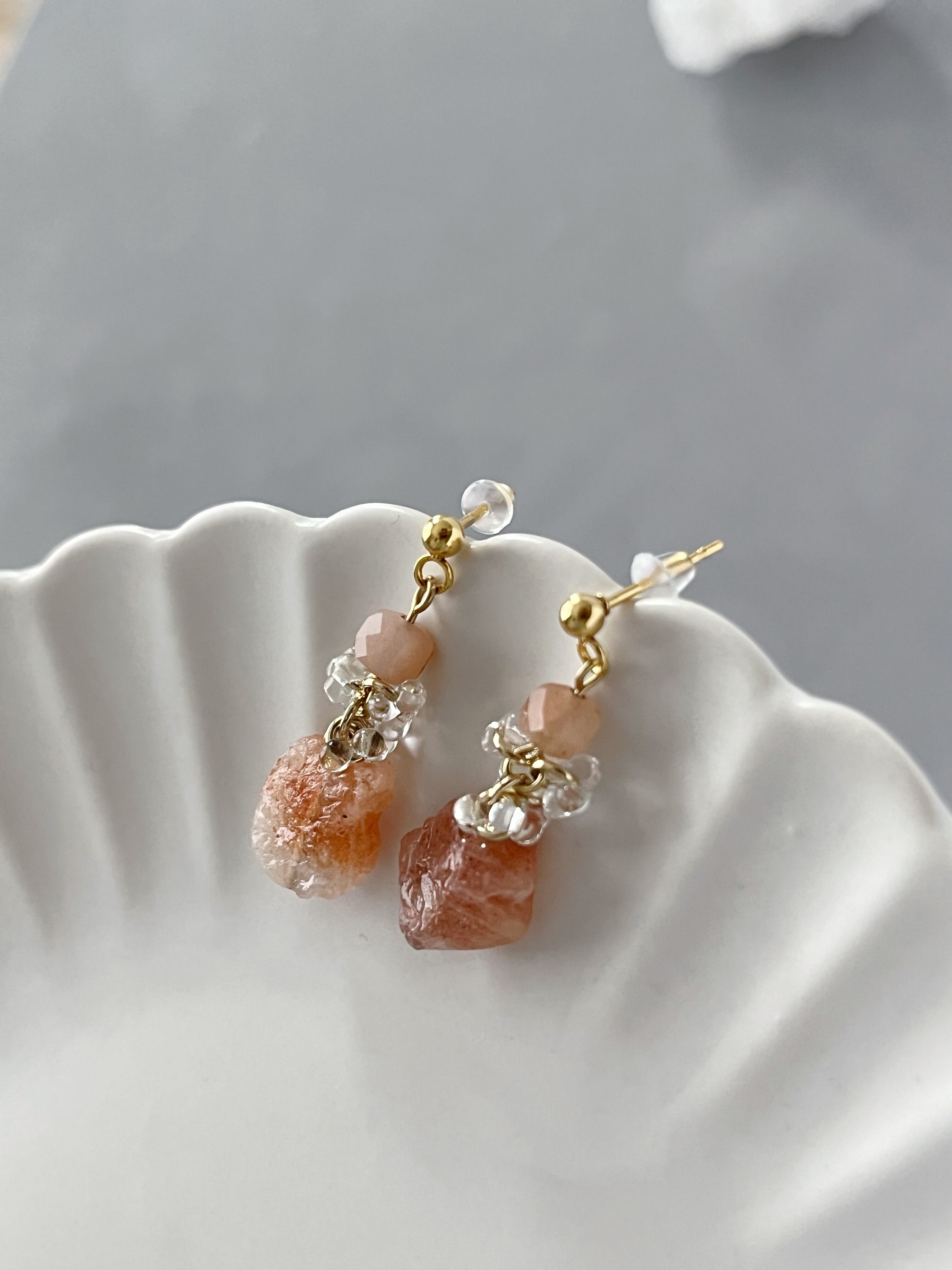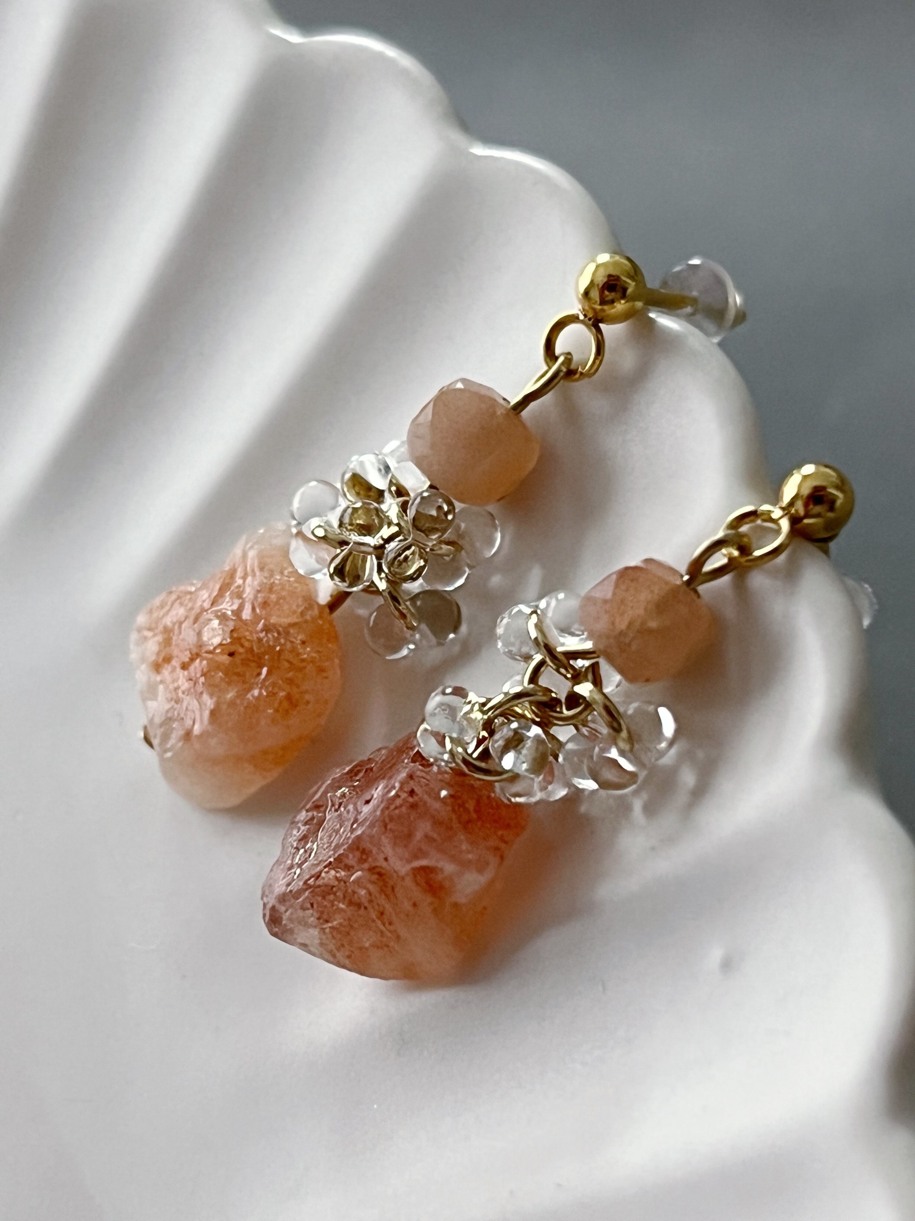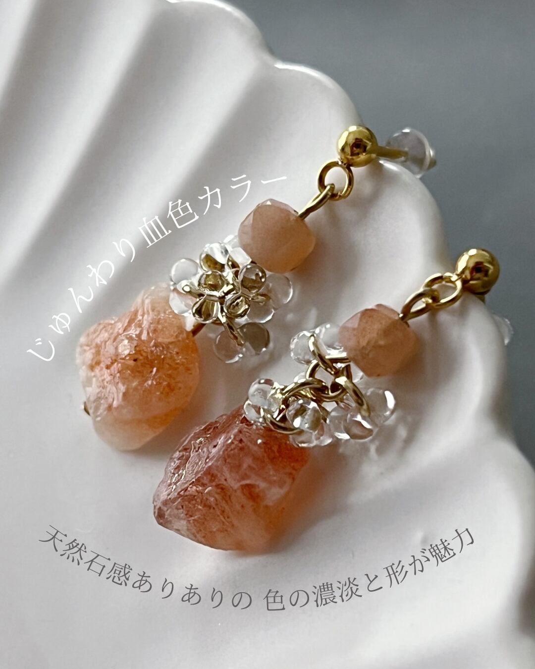 ▶︎使用素材:天然石(オレンジムーンストーン、サンストーン)、合金パーツ、ガラスビーズ