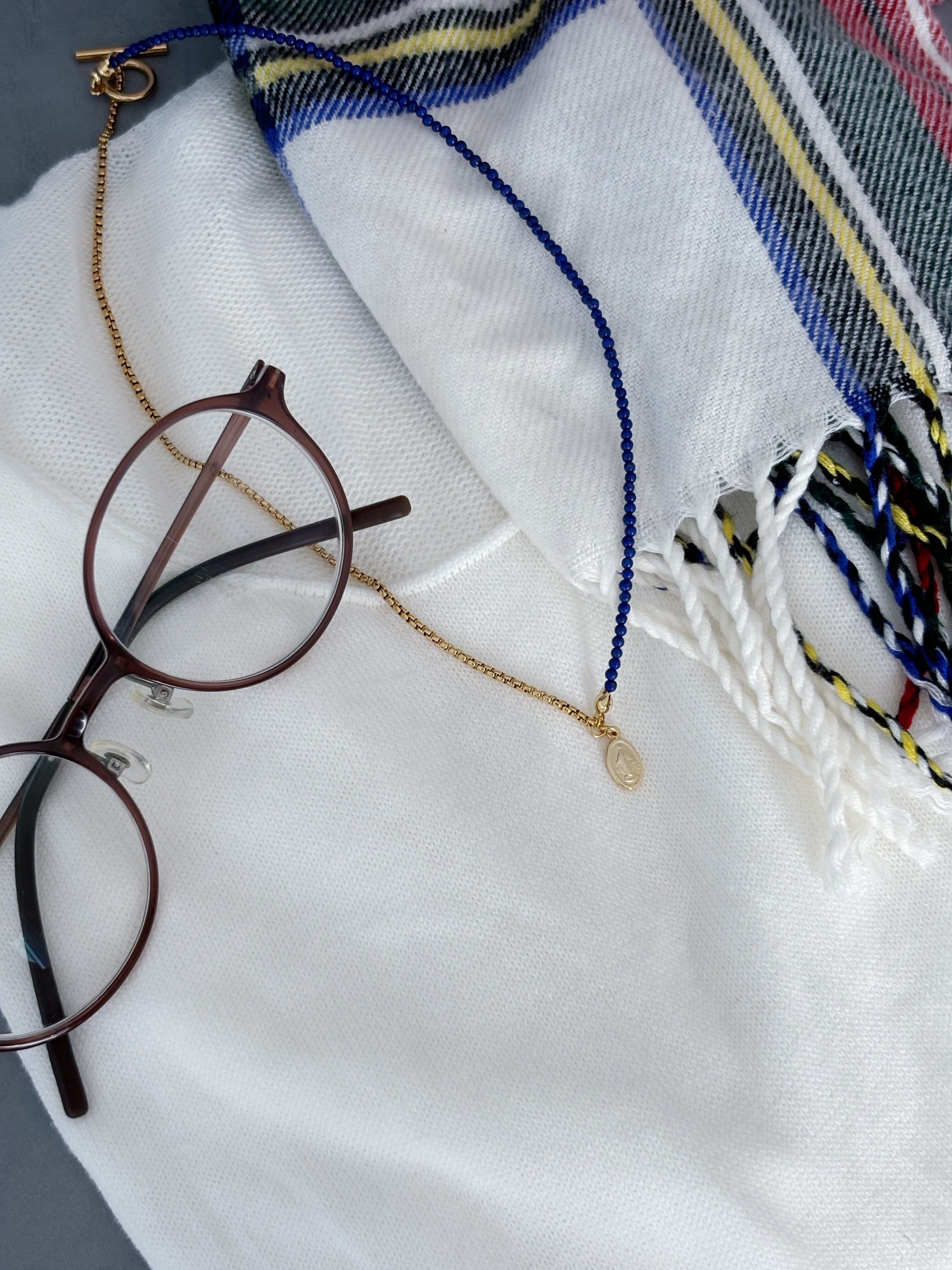 神秘的な青色のラピスラズリを使用した、洗練されたネックレスです。ラピスラズリは、古代から知恵や洞察力を象徴する石とされ、持つ人に深い思索や安らぎをもたらすと言われています。マンテルデザインの留め具は、スタイリッシュさを引き立て、使いやすさも考慮されています。